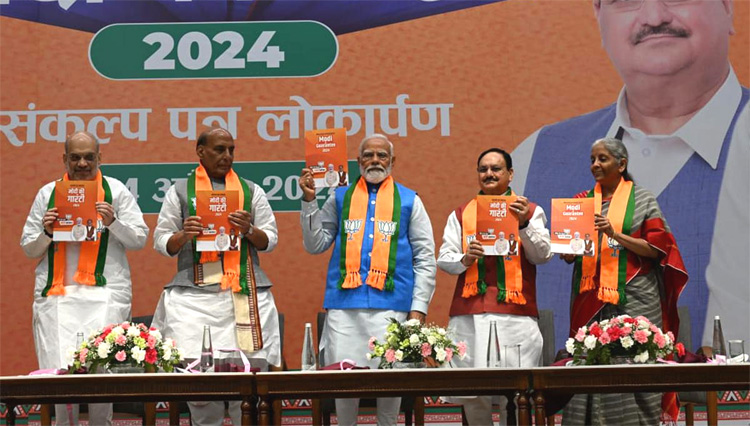 The Bharatiya Janata Party on Sunday, April 14, released its manifesto or ‘Sankalp Patra’, with the tagline “Modi ki Guarantee”, for the Lok Sabha election 2024 in the presence of Prime Minister Narendra Modi, party president JP Nadda and other senior leaders at the party headquarters.