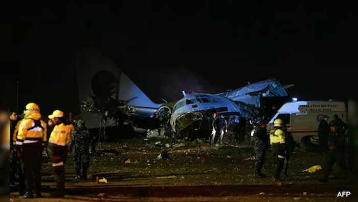 Defense Minister Marcelo Salinas said the Hercules C-130 aircraft was transporting fresh Bolivian bills when it “landed and veered off the runway” at El Alto airport in El Alto, adjacent to La Paz, before crashing into a nearby field. Firefighters extinguished flames that engulfed the plane.
