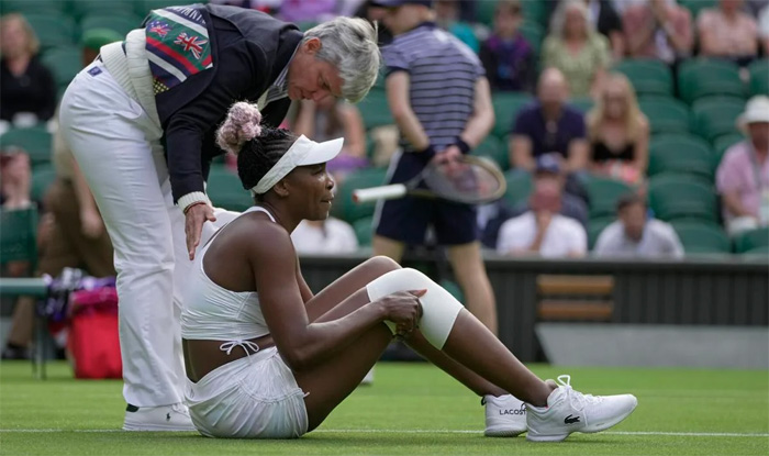 Williams took a nasty tumble early in the first set on Centre Court, hurting her right knee, which was already heavily strapped.
