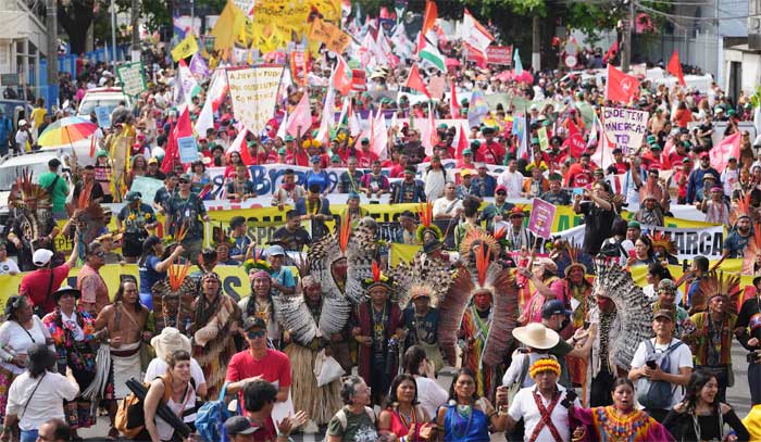 Drums, costumes and loud calls for action as climate protesters mobilize on the road to COP30