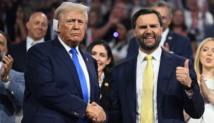Trump smiled and applauded from his box in the arena, where he sat alongside the running mate whose selection he unveiled on Monday, Senator J.D. Vance, himself a former fierce Trump critic who has become a staunch supporter.