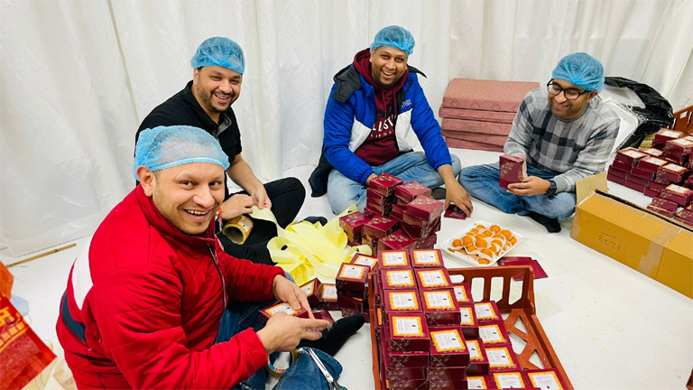 Exciting news – 250 KG of delicious Laddus and Akshat Rice are being packed for distribution among devotees.