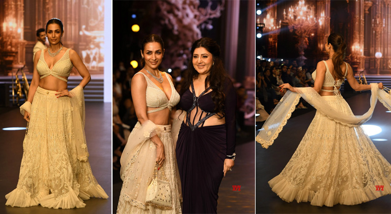 Malaika Arora stole the show last night as the showstopper for designer Archana Kochhar. She showcased the designer’s latest collection of Indian wear, looking like a princess in an ivory lehenga set from the new traditional wear line.