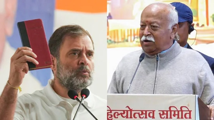 “Mohan Bhagwat has the audacity to inform the nation every 2-3 days what he thinks about the independent movement, Constitution. What he said yesterday is treason because it states that the Constitution is invalid, and the fight against the British was invalid. He has the audacity to say this publicly, in any other country, he would be arrested and tried,” Rahul Gandhi said in his speech.