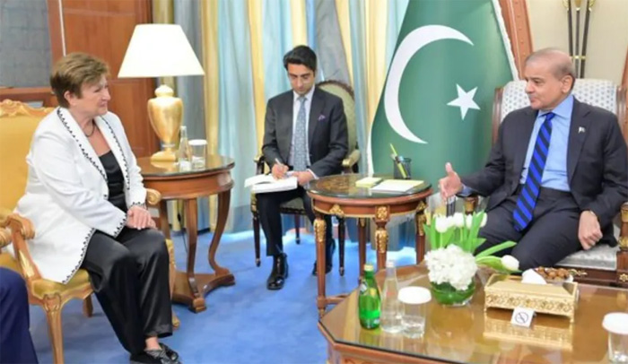 पाकिस्तान के प्रधानमंत्री कार्यालय ने बताया कि पीएम शहबाज शरीफ ने आईएमएफ की प्रमुख क्रिस्टालिना जॉर्जीवा से मुलाकात की और नकदी संकट से जूझ रहे अपने देश की अर्थव्यवस्था को पटरी पर लाने के लिए एक नए ऋण कार्यक्रम पर चर्चा की. यूएई के रियाद में विश्व आर्थिक मंच (डब्ल्यूईएफ) की एक बैठक से इतर शरीफ ने तीन अरब अमेरिकी डॉलर (करीब 24 हजार करोड़ रुपये) की अतिरिक्त व्यवस्था (एसबीए) हासिल करने में पाकिस्तान को समर्थन देने के लिए अंतरराष्ट्रीय मुद्रा कोष (आईएमएफ) की प्रबंध निदेशक जॉर्जीवा का शुक्रिया अदा किया और आगे के लिए और सहायता मांगी.