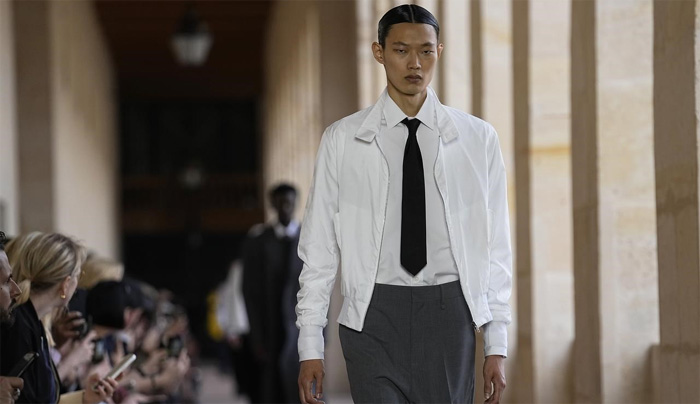 Described as a study of masculinity, the collection blended strength and gentility with a focus on refinement. Narrow tailoring, high waists, and flared trousers defined the look, while pronounced or softly flowing shoulders and long, lean sleeves exuded elegance.