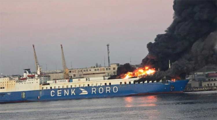 Ukrainian President Volodymyr Zelensky shared images showing a large fire aboard a vessel docked at the port of Chornomorsk in the Odesa region, with firefighters battling the blaze.