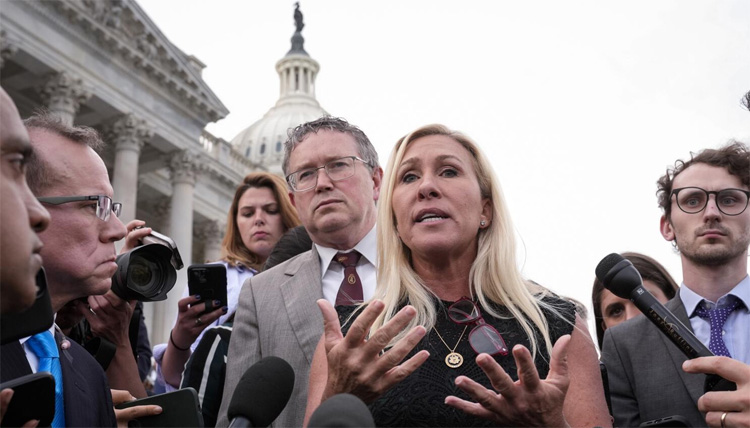 Greene stood flanked by fellow Republican Thomas Massie when she made her move against Johnson, criticizing him for a string of compromises with Democrats, who hold a majority in the Senate.